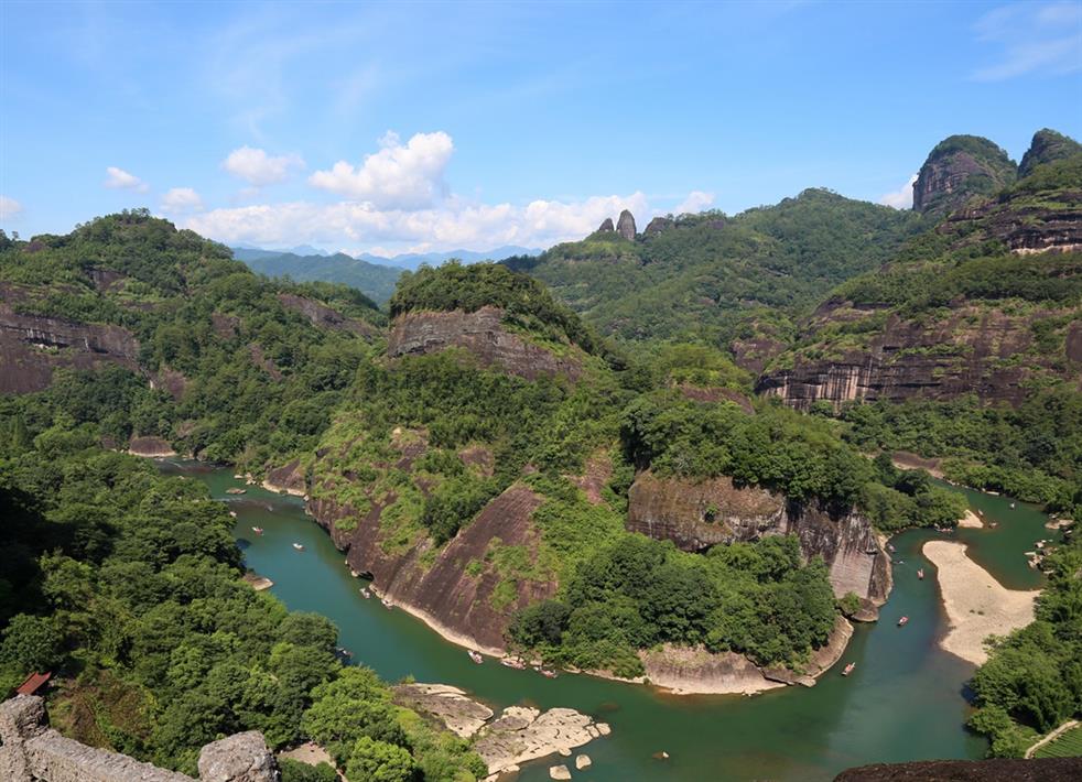 登山之后,大家乘坐古樸竹筏蕩入武夷山山光水色之中,沿九曲溪隨波逐流而下,體驗唯美與刺激的碰撞。溪面忽而平緩似池,忽而湍急如潮,竹筏隨之或珊珊而行,有驚無險中,兩岸美景走馬觀花盡收眼底。無登山之勞,有涉水之樂,抬頭山景源源而來,俯首水色飄拂而去,有一種“人在畫中游”的感覺。夜幕降臨時,大家還觀看了全世界唯一展示中國茶文化的大型山水實景演出《印象大紅袍》,領略了夜色中的武夷山之美,在恢宏壯闊的場景中深入體驗了不同的武夷“山水茶”文化。